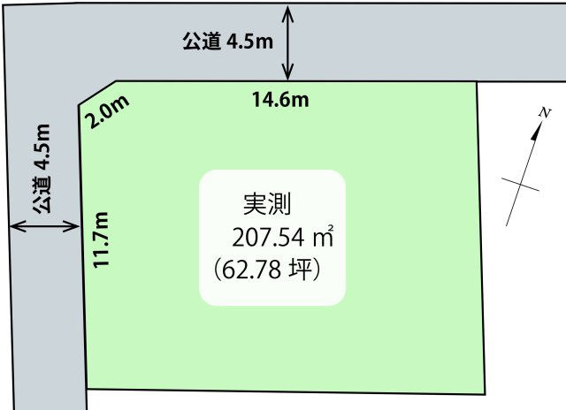 | 接道状況 | 角地 (北西側 公道4.5m 間口14.6m) (南西側 公道4.5m 間口11.7m) | ||